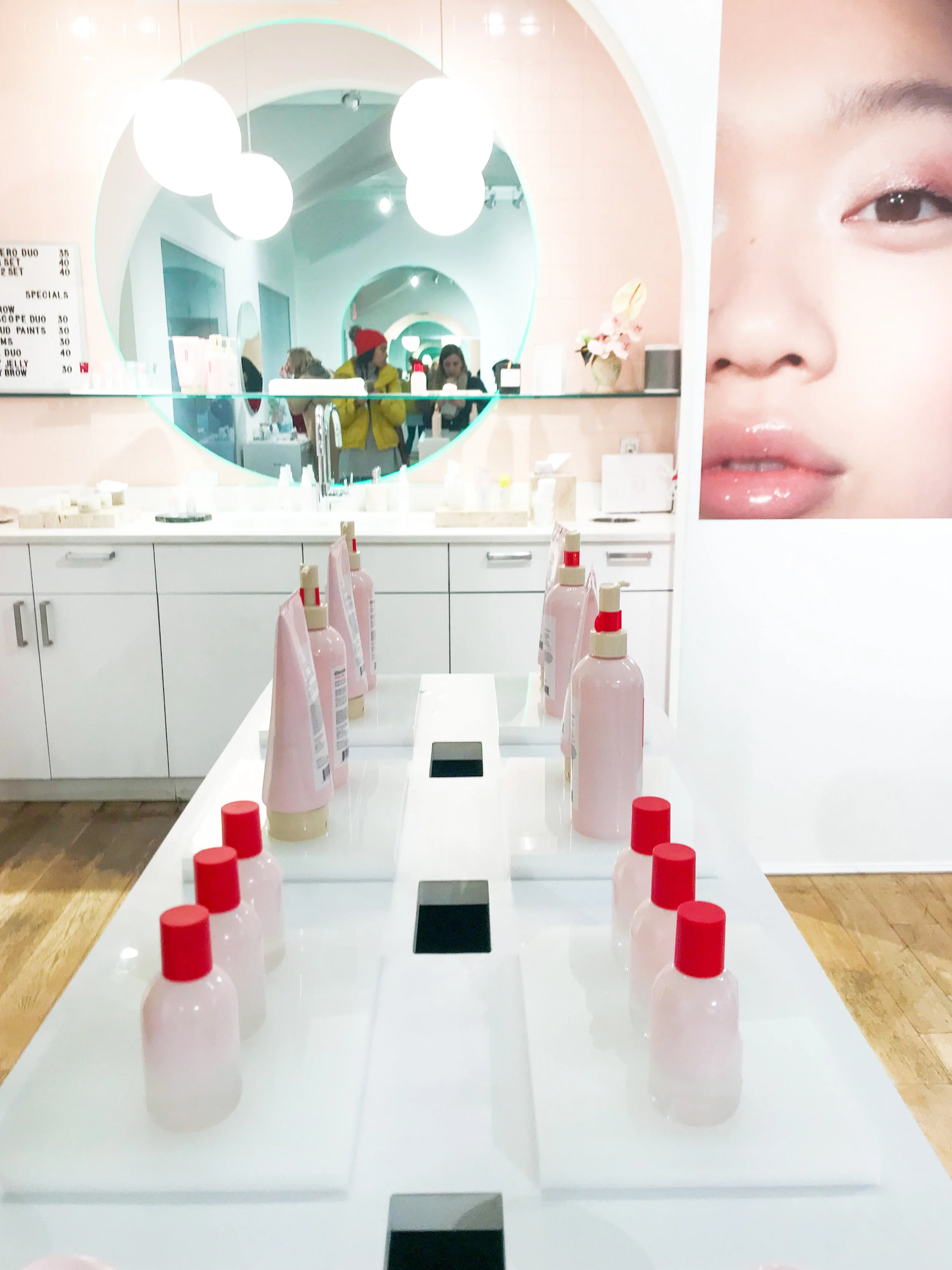 Ok, so the penthouse is located right outside Chinatown on 123 Lafayette and was recently housed in the same building as Glossier’s corporate office. You can’t miss the building when you are close as they have big flags outside that say Glossier! When you enter the building you will be greeted by a Showroom Editor who wear a pink jumpsuit (I’ve never wanted a prison jumpsuit but seeing them in millennial pink kinda changes things I won't lie). You will also notice a bunch of bags hanging on a rack in the buildings lobby. You can now order online and pickup in store. This is a newer feature as when I first started going to the penthouse they did not have this option. Great for the NYC girl on the go who needs her Boy Brow.